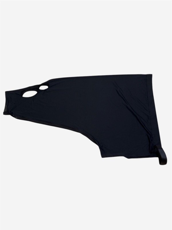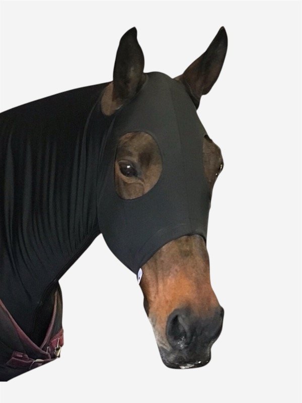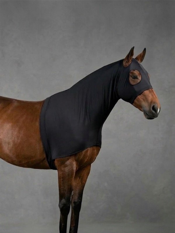 La cogotera Tesaria con careta está confeccionada en lycra de alta calidad, diseñada para brindar un ajuste anatómico perfecto y máximo confort al caballo. Su tejido elástico se adapta suavemente a la cabeza y cuello, proporcionando una compresión uniforme que favorece la relajación y reduce el estrés.