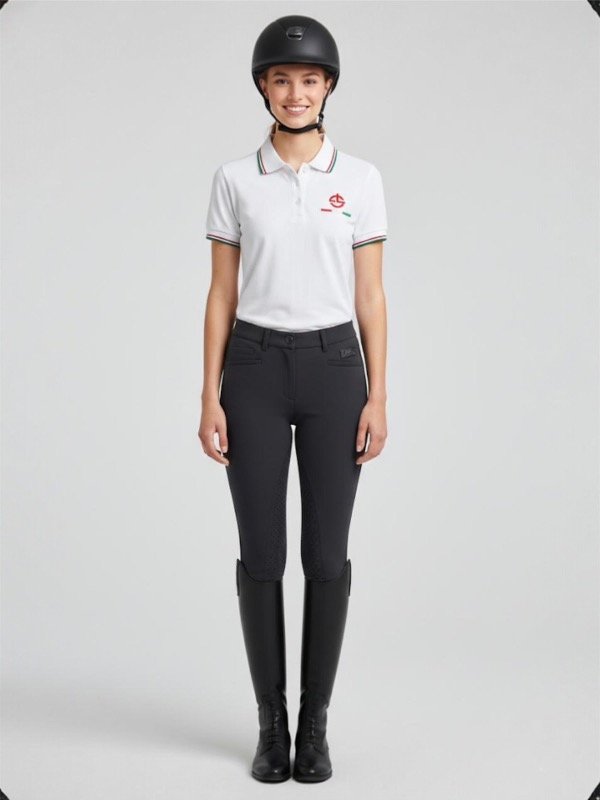 El logo La Squadra en el frente refuerza la identidad de la prenda, mientras que su calce femenino acompaña el movimiento sin perder estructura. Perfecta para combinar con breech de montar y botas, logrando un look elegante tanto en pista como fuera de ella.
